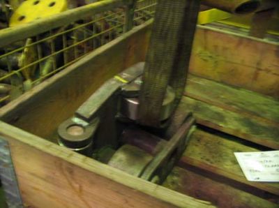 Der von den Versicherten in Verbindung mit einem Hersteller für Anschlagmittel entwickelte 3-Arm-Scherengreifer ermöglicht ein sicheres waagerechtes Anheben der Last. Er ist ausschließlich für einen bestimmten Einsatz konzipiert und auf die Form des Werkstückes angepasst. Die Greifarme des Scherengreifers sind vor dem Anschlagen der Last in geöffnetem Zustand. Beim Aufsetzen des Greifers auf ein Werkstück wird eine Mechanik betätigt, und ein Greifarm setzt sich in eine an dem Werkstück befindliche Aussparung ein. Der gegenüberliegende Greifarm fasst unter die Halterung der Führungsrolle. Dies ist bei eingebauter sowie bei ausgebauter Führungsrolle möglich. Am Anschlagmittel befindet sich ein Handgriff, der ein sicheres Manövrieren des Anschlagmittels und der Last beim Einbau bzw. beim Einlegen in das Montagegestell ermöglicht.