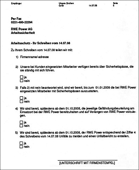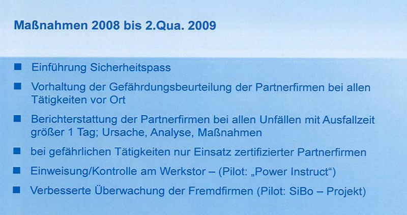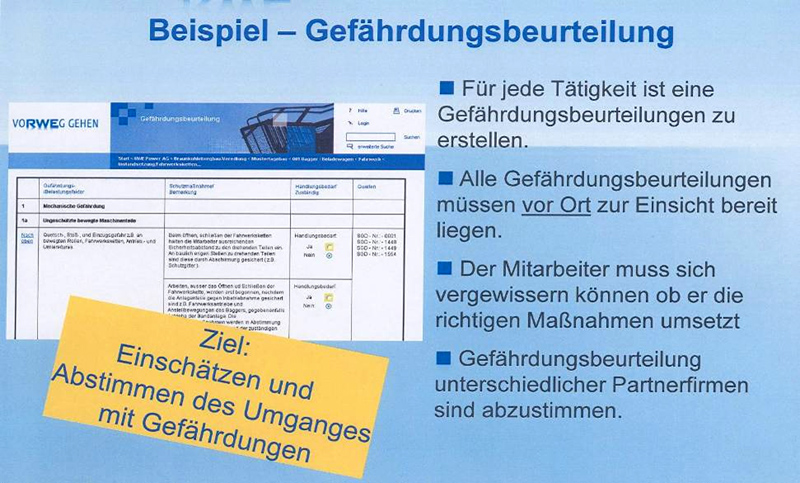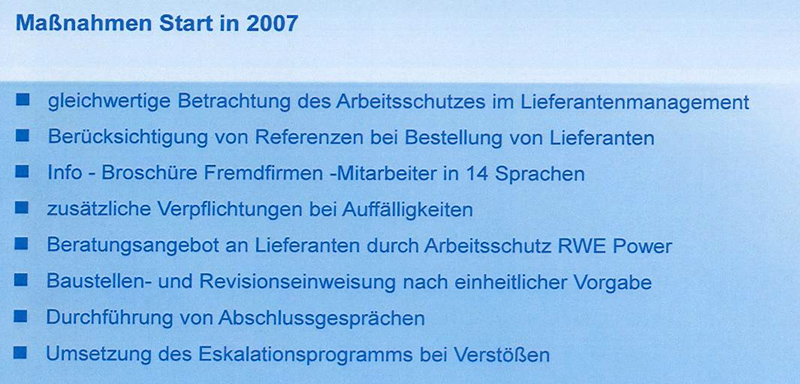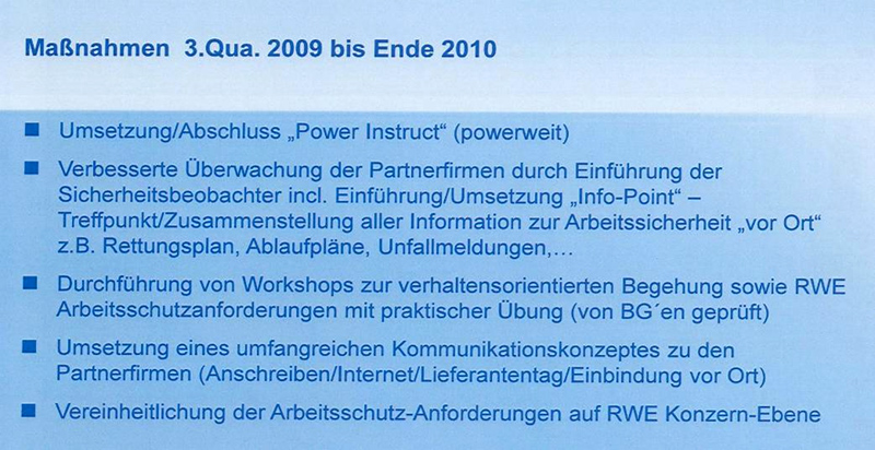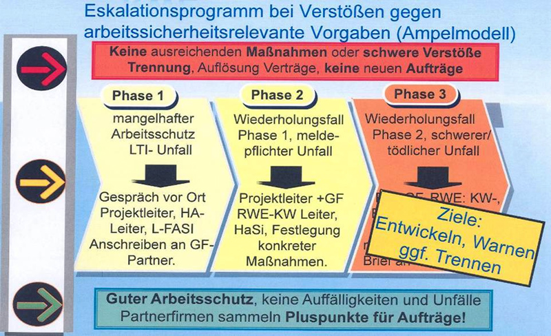 Für umfassende Informationen wurde ein Workshop für Partner zum Thema RWE-Arbeitsschutzkultur und Verhalten der Mitarbeiter eingerichtet. Einen hohen Stellenwert bei der praktischen Umsetzung nimmt die Berücksichtigung von Referenzen bei der Bestellung von Lieferanten (Auswahl, Bewertung, Klassifizierung, Weiterentwicklung) ein. Grundsätzlich ist ein Sicherheitspass erforderlich, der aufgabenspezifische Qualifikationen dokumentiert. Es erfolgt eine Vorhaltung der Gefährdungsbeurteilung der Partnerfirmen bei allen Tätigkeiten vor Ort. Sicherheitsbeobachter überwachen die von den Partnerfirmen vorgeschlagenen Optimierungen und Abhilfemaßnahmen vorrangig bei Großrevisionen, Instandhaltungen und dem Einsatz vieler Partnerfirmenmitarbeiter.