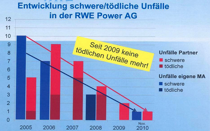 Durch kontinuierliche und nachhaltige Verbesserung des Arbeitsschutz-Management-Systems (AMS) sowie innovative Programme zum Arbeitsschutz konnten in der RWE Power während der letzten Jahre die Unfallzahlen stetig um 20 Prozent jährlich gesenkt werden. RWE Power erwarb das Gütesiegel „Sicher mit System“ im Jahr 2007 und wurde 2010 erneut erfolgreich zertifiziert. Im Gegensatz zur steigenden Quote im eigenen Unternehmen konnte bei Partnerfirmen nicht sofort der gleiche Erfolg erzielt werden. Hier setzt das Programm „Sicher voRWEg mit Partnern“ an.