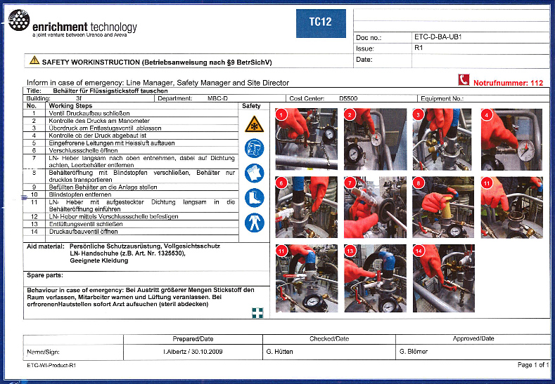 Als Arbeitsanweisungen haben sich in anderen europäischen Ländern bildgestützte Dokumentationen der Arbeitsschritte bewährt. Betriebsanweisungen „deutscher Art“ sind dort nicht bekannt. Die Lösung der Enrichment Technolgy Co. Ltd. integriert die Inhalte der Betriebsanweisungen in die Arbeitsanweisungen. Textinhalte der standardisierten „Safety Work Instructions“ stehen somit in den Muttersprachen der Mitarbeiter zur Verfügung und tragen wesentlich zum Verständnis wichtiger Informationen bei.