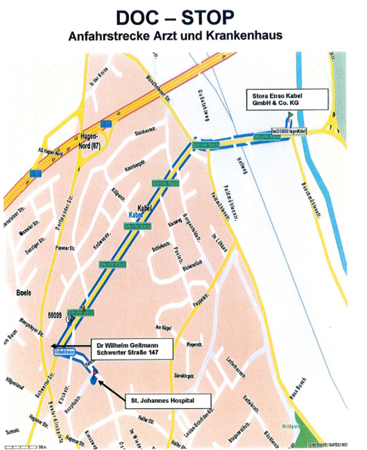Defibrillatoren können durch gezielte und dosierte Stromstöße gefährliche Herzrhythmusstörungen wie Kammerflimmern und Kammerflattern beenden. Zur Verbesserung der Notfallkette verfügt die Stora Enso Kabel GmbH & Co. KG, Hagen, über fünf dieser Geräte. Jeder Einsatz löst beim Pförtner ein Alarmsignal aus. Ein weiterer medizinischer Baustein im Unternehmen ist die Einführung des „Doc Stop“-Versorgungskonzeptes für Berufskraftfahrer.