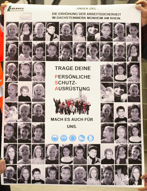 Im Dachsteinwerk Monheim der Lafarge Dachsysteme GmbH wurde ein Motivationsplakat entwickelt, welches die genannten Anforderungen in vollem Umfang erfüllt. So wurde mit dem Einverständnis der Mitarbeiter ein Plakat mit den Kindern der Beschäftigten gestaltet. Die Botschaft lautet: „Trage deine Schutzausrüstung – tu es für uns“. Ziel ist, den Mitarbeitern täglich ins Bewusstsein zu rufen, dass sicherheitswidriges Verhalten nicht nur die eigene Gesundheit tangieren kann, sondern auch die (soziale) Sicherheit ihrer Kinder und Angehörigen.
