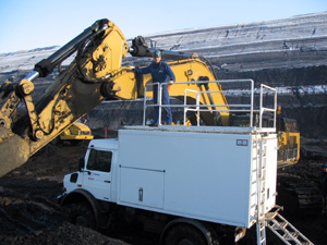 Reparaturen und Instandsetzungen an Tagebaugroßgeräten bergen das Risiko, beim Ausführen dieser Tätigkeiten abzustürzen. Der Leiter des Fahrzeugmanagements im Helmstedter Revier der E-ON Kraftwerke GmbH, Joachim Nagel, hatte die Idee, mittels einer Fahrzeug-Sonderkonstruktion auf dem Dach eines Werkstattwagens eine absturzsichere Arbeitsbühne zu installieren.