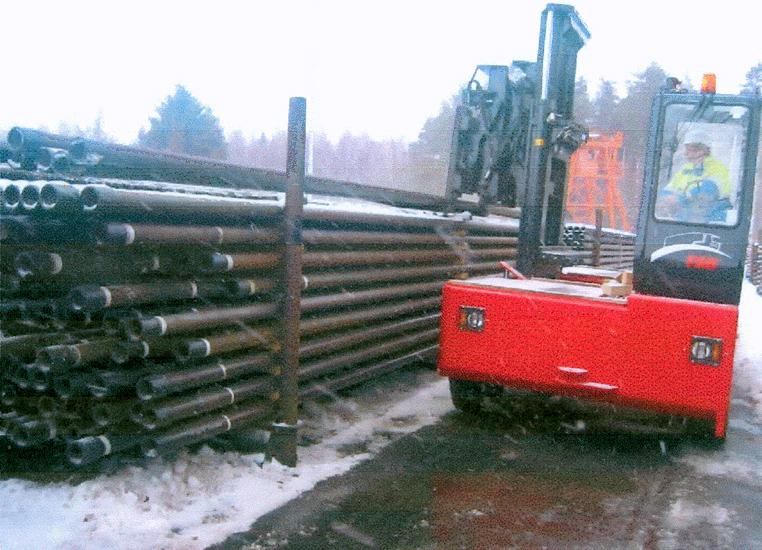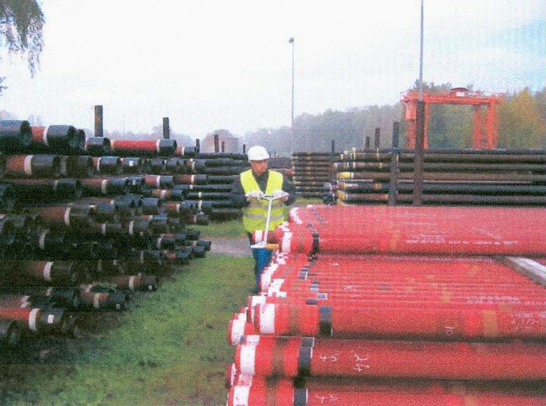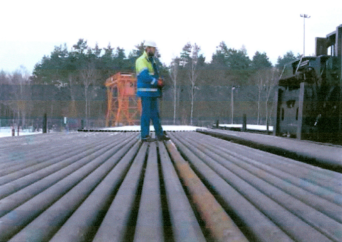 Steigrohre der Erdöl- und Erdgas-Industrie mit einem Außendurchmesser von bis zu 20 Zentimetern werden auf Stapeln gelagert. Zur Entnahme betreten Mitarbeiter den Rohrstapel über eine Leiter und rollen die Rohre zum Ende des Stapels. Um die Unfallgefahr zu minimieren, hat die ExxonMobil Production Deutschland GmbH, Hannover, ein Hilfsmittel entwickelt, mit dem die Rohre vom Boden aus bewegt werden können.