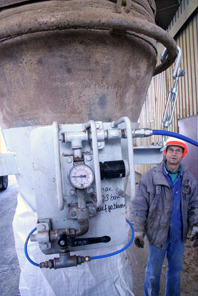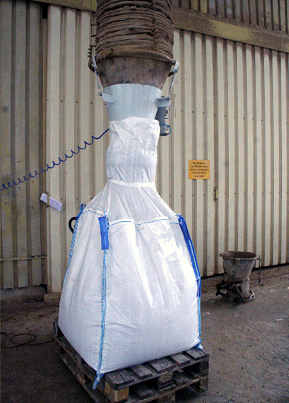 Für den Transport von losen, trockenen Schüttgütern in kleineren Mengen kommen Textilcontainer, so genannte „Big Bags“ zum Einsatz. Aus wirtschaftlichen Gründen werden diese oft mit Hilfe des Verladerüssels für Silo-Lkw befüllt. Da die Gummiverkleidung der Rüssel nicht auf die Big Bags zugeschnitten ist, droht an den provisorischen Adaptern eine erhöhte Unfallgefahr. Um dieses Problem zu lösen, hat die Sebald Zement GmbH, Pommelsbrunn, einen Adapter mit aufblasbarer Gummimanschette konstruiert.