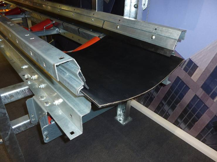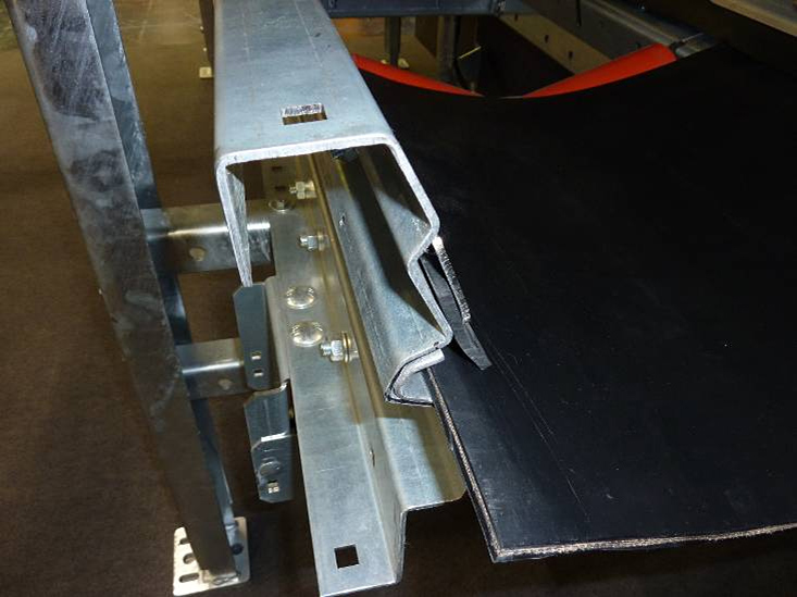 Durchgehende Gurtführungen mit Schleißprofilen verhindern, dass Gummigurte seitlich verlaufen. Dadurch vergrößert sich die Nutzbreite zwischen den Materialführungen. Der Gestellrahmen ist gleichzeitig Materialführung, Gurtführung und Tragrollenhalter und kann im Aufgabebereich mit zusätzlichen Dichtlippen versehen werden. Rasterlochungen im Gestellrahmen erlauben unterschiedlichste Rollenabstände für Tragrollen, Unterbandrollen und Stützanschlüsse.