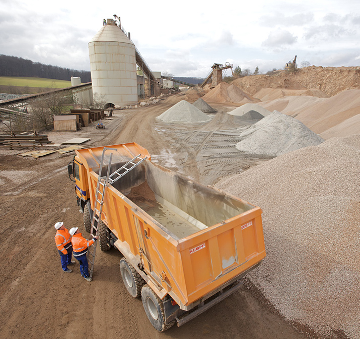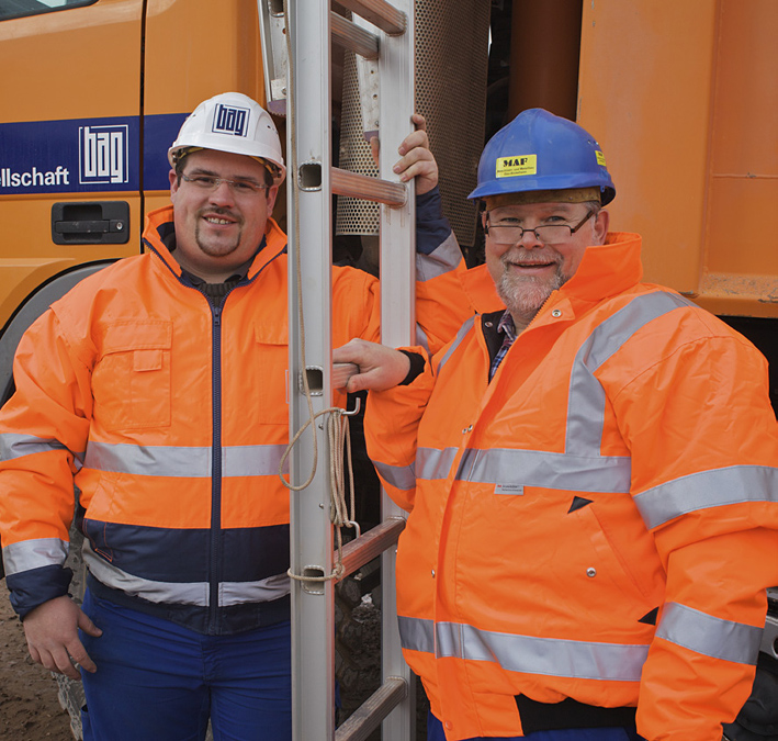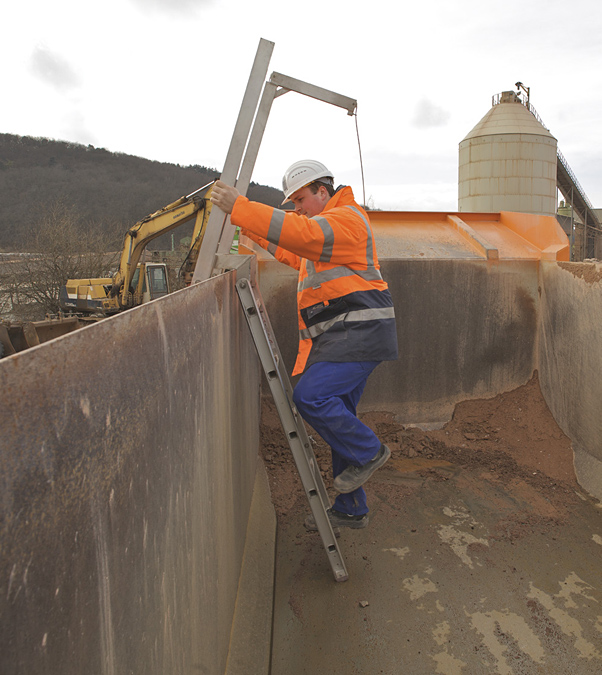Die Basalt-Actien-Gesellschaft, Südwestdeutsche Hartsteinwerke, Werk Neu-Bamberg, setzt Lkw mit Schüttgut-Mulden zum Transport mineralischer Rohstoffe ein. Zu Reinigungsarbeiten steigt ein Mitarbeiter in die Mulde. Der Einstieg erfolgt ohne Hilfsvorrichtungen direkt am Fahrzeug und bedeutet Absturzgefahr. Eine neu konstruierte, tragbare Klappleiter ermöglicht das sichere Betreten der Mulde.