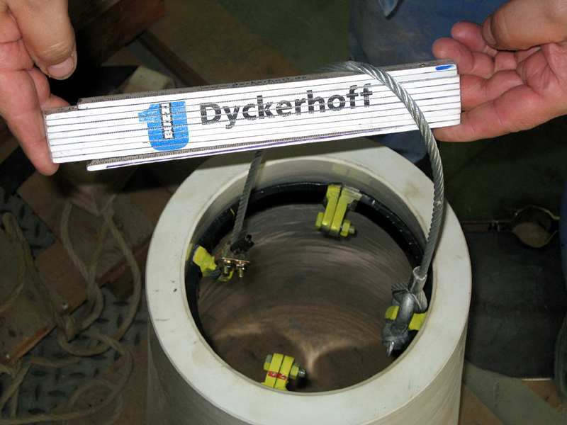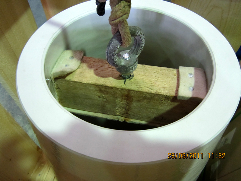 Die neue Einbauhilfe besteht aus einem zweiteiligen Tragring mit Drahtseilschlaufe und einer Traverse mit manuellem Kettenzug als Hebevorrichtung. Für den Wechsel wird der Tragring auf den Boden gelegt und der Isolator darüber platziert. Der Haken des Kettenzuges wird von oben durch den Isolator an der Seilschlaufe des Tragringes befestigt und hochgezogen. Dadurch verspannt sich der Tragring im oberen Teil des Isolators und dieser kann ohne Gefahr des Abrutschens bewegt werden. Der Isolator kann nun hochgezogen, nahezu pendelfrei an der Traverse über die Einbauöffnung bewegt, mittig ausgerichtet und auf seinen Sockel herabgelassen werden. Anschließend wird der Tragring von unten auseinandergeschraubt und aus dem Isolator genommen.