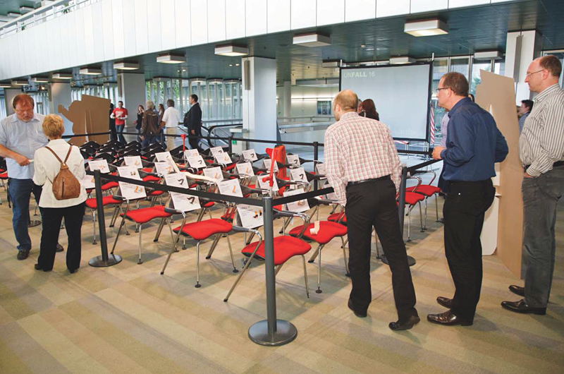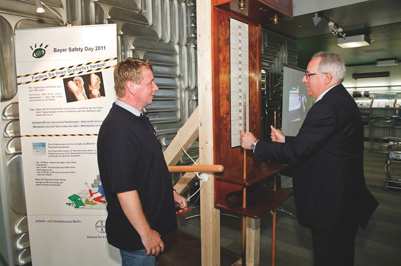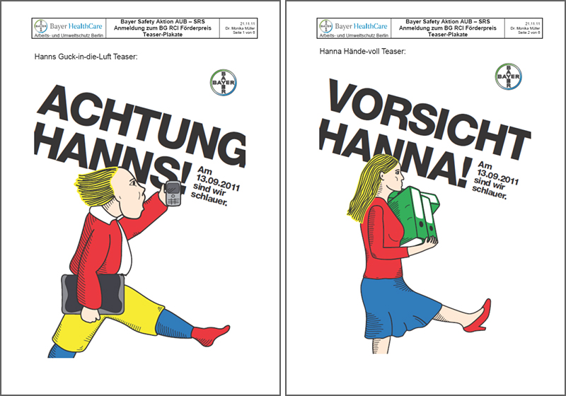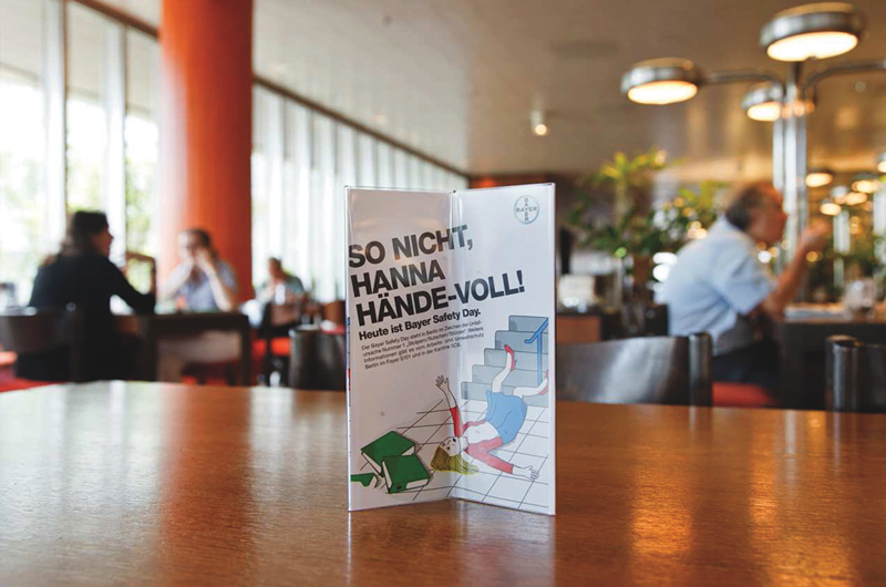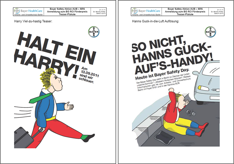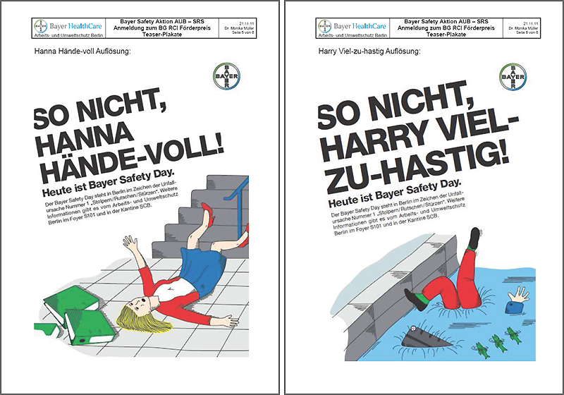 Die Aktion setzt das bei Bayer weltweit ausgerufene Thema „Sicherheit geht alle an“ in die Praxis um. Auf Plakaten und Aufstellern zu „Hanns Guck-in-die-Luft“, „Hanna Hände-voll“ und „Harry Viel-zu-hastig“ werden bekannte Gefährdungen und deren mögliche Folgen bildlich dargestellt. Das Kernstück der Aktion war eine Stuhlinstallation im Foyer des Hauptgebäudes. Jeder der SRS-Unfälle am Standort Berlin wurde durch einen roten Stuhl dargestellt. Auf jedem Stuhl war auf einem DIN A4-Schild in knappen Worten der Unfallhergang mit Anzahl der Ausfalltage zu lesen. Diese plastische Darstellung des „Stuhl-Mahnmals“ hat die „nackte“ Zahl der Statistik von SRS-Unfällen mit Emotionen belegt. Sie sorgte bei vielen für Betroffenheit und regte somit zum Nachdenken an. Mitarbeiter suchten neugierig nach ihrem Unfall oder dem ihres Kollegen. Aktionsstationen wie Reaktionstester oder ein nachgestellter fiktiver Unfallschauplatz verdeutlichten die Botschaft.