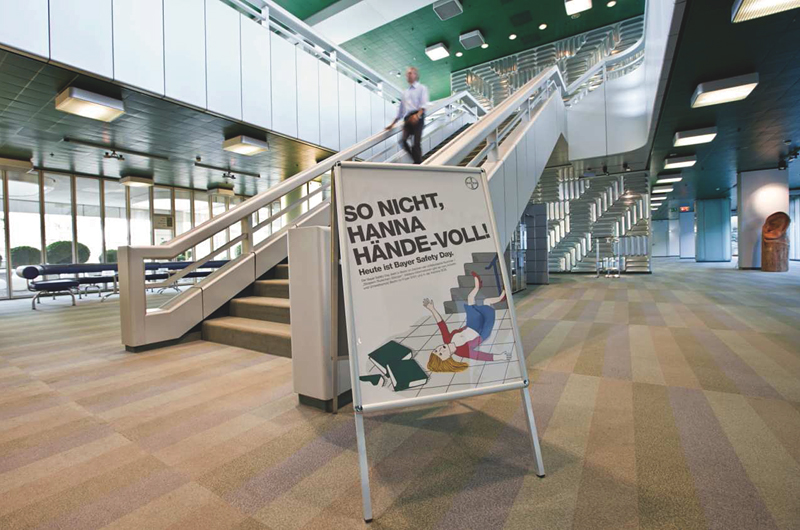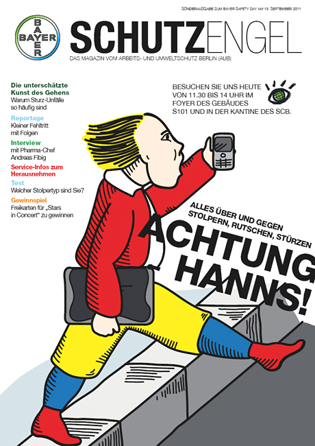 Hanns Guck-in-die-Luft aus dem „Struwwelpeter“ kennt fast jeder. Er ist ein Träumer, der durch mangelnde Aufmerksamkeit in so manch gefährliche Situation gerät. Doch auch nach 166 Jahren behält die Geschichte von Heinrich Hoffmann ihre Aktualität. Die Bayer Pharma AG, Berlin, nutzt die aussagekräftigen Bildmotive in unterschiedlichen Präsentationsformen, um auf die Unfallursachen Stolpern, Rutschen und Stürzen (SRS) aufmerksam zu machen.