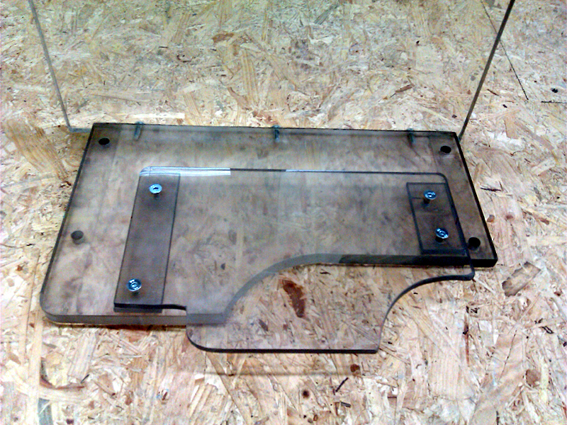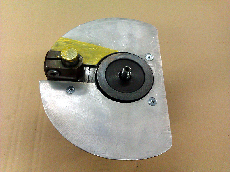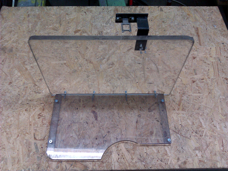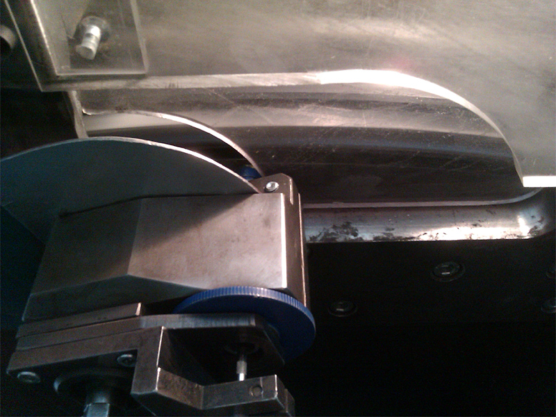 Um den Schleifvorgang sicherer zu gestalten und ein Erreichen der Messer wirksam zu verhindern, entwickelte ein Mitarbeiter eine neue Konstruktion. Hierzu wurde eine Aluminiumscheibe auf die Schleifvorrichtung geschraubt. Die Scheibe ist so dimensioniert, dass sie über die Schleifvorrichtung hinaus ragt. Dadurch wird verhindert, dass Mitarbeiter bei manuellem Eingreifen durch Abrutschen in den Bereich der Messer gelangen können. Zusätzlich wurde eine vorhandene Plexiglasabdeckung so umgestaltet, dass ein seitlicher Zugriff in die Maschine ausgeschlossen ist.