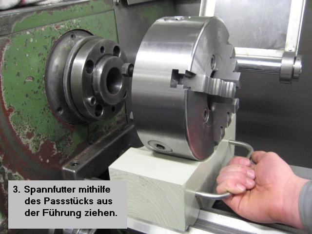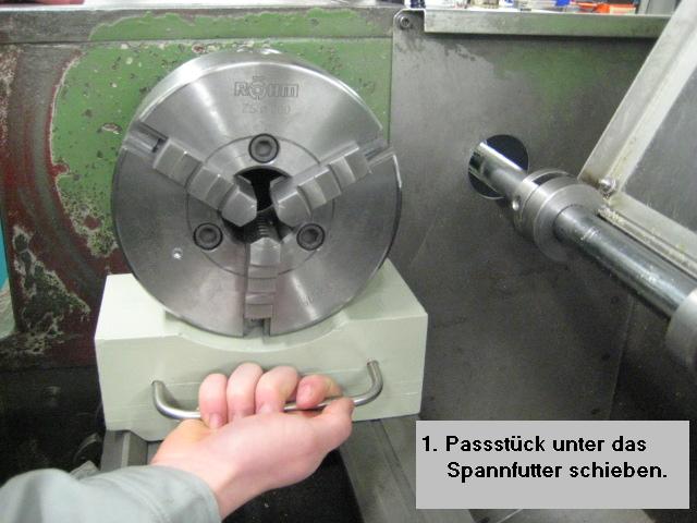 Das Passstück ist aus Holz gefertigt und mit einem Griff aus Metall versehen. Vor dem Wechsel wird das Passstück auf die Führungsschienen der Drehmaschine gelegt und unter das Spannfutter geschoben. Das Futter liegt nun sicher auf dem Stück, kann gelöst und am Griff gefahrlos herausgezogen werden. Umgekehrt wird das neue Spannfutter auf das Passstück gelegt und auf den Schienen in die Endposition gefahren. Dort kann es problemlos montiert werden.