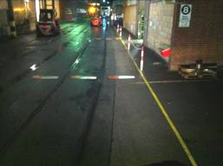 Der dreidimensionale Effekt der reflektierenden Markierungen ist auch bei Dunkelheit deutlich erkennbar. Mit geringem Kostenaufwand konnte hier eine langfristige Verhaltensänderung bei Lkw-Fahrern erreicht werden. Die 3D-Markierungen wurden bei einem gewerblichen Anbieter gekauft und nach dessen Vorgaben vom Mitgliedsbetrieb aufgebracht.