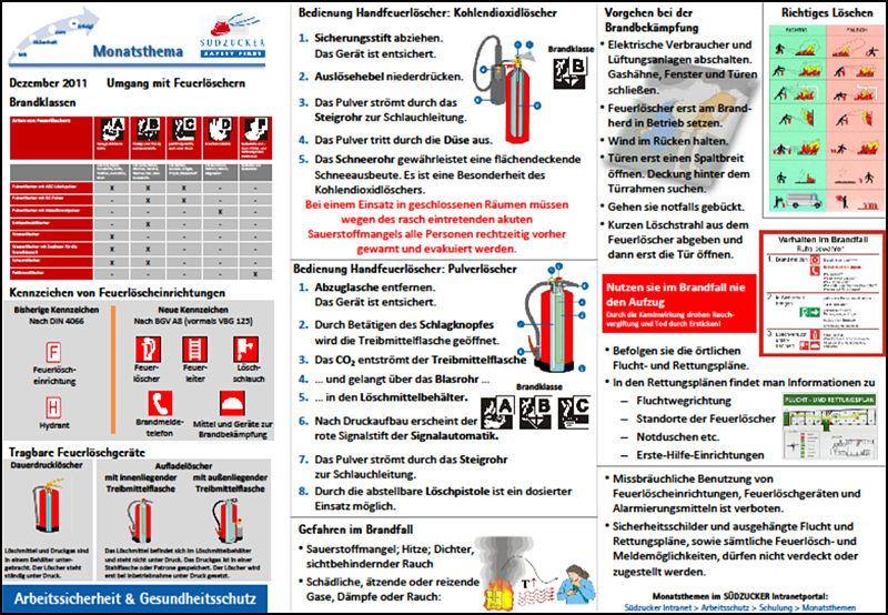 Regelmäßige Informationen und Unterweisungen zum Thema Arbeitssicherheit fördern Kenntnisse bei allen Beschäftigten. Der Vorschlag der Südzucker AG orientiert sich an Vorgehensweisen bei den bildgestützten Kurzinformationen der BG RCI. Spezielle Themen zu Arbeitssicherheit und Gesundheit werden über unterschiedliche Medien vermittelt. Ein monatlich wechselnder Schwerpunkt sorgt dabei für Abwechslung.