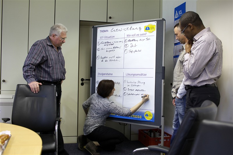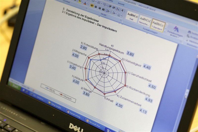 Siegfried Groß, Bernd Koch, Georg Selinger und Holger Bickel aus dem Unternehmen ICL/BK Giulini GmbH aus Ludwigshafen und Ladenburg haben sich diesem Problem gestellt. Nach einer Marktanalyse entschlossen sie sich, in Abstimmung mit der Unternehmensleitung und der Arbeitnehmervertretung, den in Österreich wissenschaftlich entwickelten „Impulstest“ flächendeckend im Unternehmen umzusetzen. Nach einer Qualifizierung interner Moderatoren wurden so in allen Abteilungen Workshops durchgeführt, bei denen die Beschäftigten ihre tägliche Arbeit aus ihrem Empfinden heraus bewerten, aber auch entsprechende Wunschvorstellungen einbringen konnten. Die noch im Rahmen des Workshops erfolgte Auswertung über eine Spinnennetzgrafik zeigte unmittelbar Bereiche, an denen Wunsch und Wirklichkeit deutlich voneinander entfernt waren und damit Handlungsbedarf gegeben war. Diese Themen wurden mit der Belegschaft gezielt vertieft und Lösungsmöglichkeiten entwickelt.