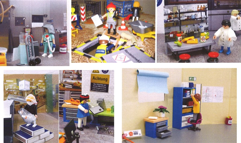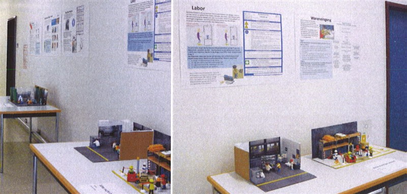 Fragebögen erläutern die jeweilige Szene und lenken den Fokus durch gezielte Fragen auf das zentrale Thema der Situation. Poster ergänzen die dargestellten Miniaturszenen. Sie zeigen reale im Betrieb verwendete Betriebsanweisungen, Bedienungsanleitungen oder Instruktionen. Durch einen Vergleich der Informationen auf den Postern mit der Spielszene wird der Beobachter in die Lage versetzt, Fehler/Fehlverhalten der Figuren zu identifizieren oder Gefahrensituationen zu erkennen.