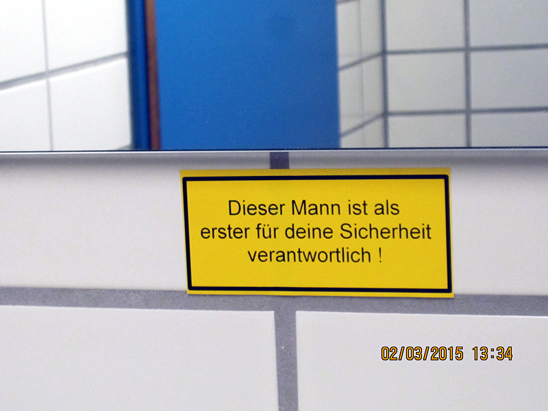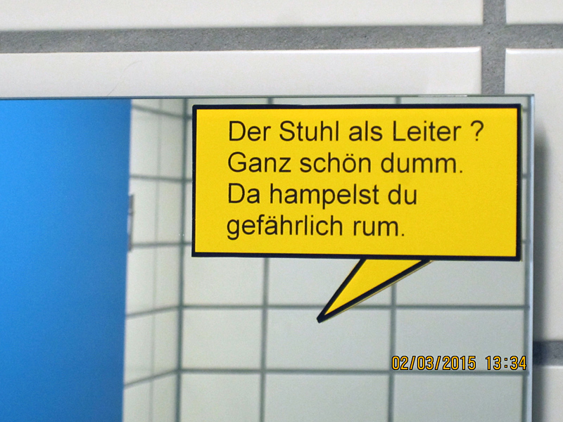 Unter dem Motto „Bewusstseinsbildung über das eigene Spiegelbild“ wurden Aufkleber für Spiegel entwickelt und produziert. Denn wem vertraut und glaubt man mehr als sich selbst? Die Gestaltung und Motive wurden mit den Auszubildenden des Standortes erarbeitet. Gleichzeitig konnte den Auszubildenden das Thema Arbeitssicherheit auf lockere Art und Weise vermittelt werden.