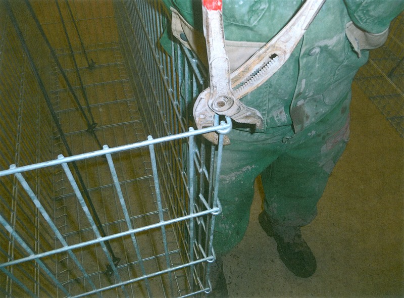 Die Geiger Kanaltechnik GmbH & Co. KG fertigt im Werk Oberstdorf Metallkörbe für die Aufnahme von Natursteinen, sogenannte Gabionen. Die einzelnen Seiten-, Boden- und Deckelelemente werden mit Metallklammern verbunden. Die Klammern werden mit Zangen manuell zusammengedrückt. Dies erfordert hohen Kraftaufwand, der häufige, krankheitsbedingte Ausfälle zur Folge hatte. Eine neue Presszange soll die Arbeit erleichtern.