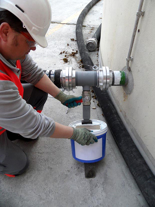 Die Gefährdungsbeurteilung der Probenahme ergab, dass der Vorgang nicht mit der erforderlichen Sicherheit durchgeführt werden konnte und eine alternative Probenahmemöglichkeit notwendig ist. Somit entschloss man sich, die Probeentnahme künftig am Auslauf- bzw. Entladestutzen des Silos vorzunehmen. Dazu wurde ein Probenehmer entwickelt, der zwischen dem Entladeschlauch des Lkws und der Steigleitung des Zementsilos installiert wird. Der Probenehmer besitzt einen Kugelhahn, der zur homogenen Probenahme während des Entladevorgangs mehrmals geöffnet wird, um das Material in einem Probeeimer aufzunehmen. Die Probe wird verschlossen, beschriftet und an das Labor gegeben.