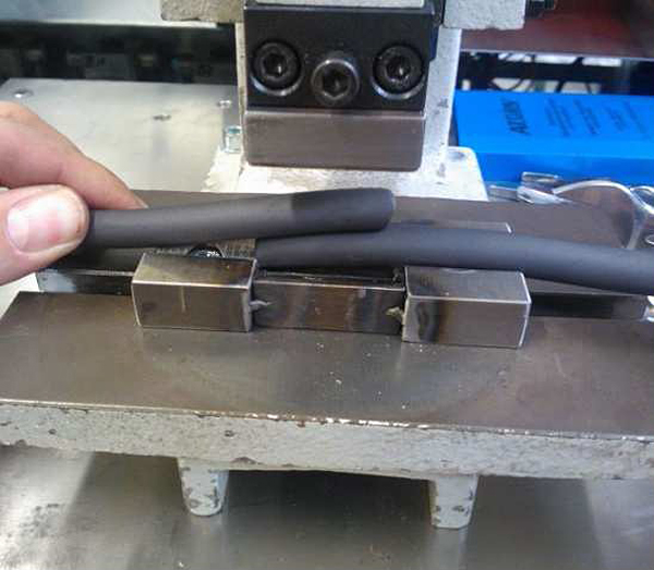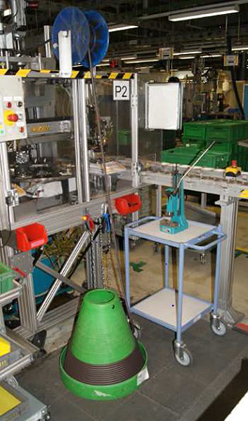 Um diese Gefahren auszuschließen, sollte auf den Aufstieg auf das Podest verzichtet werden. Hierzu wurden verschiedene Versuche angestellt, wie man die Rundschnüre, die der Spritzgießmaschine zugeführt werden sollen, miteinander verbinden kann, auch wenn es sich um unterschiedliche Materialien handelt. Zunächst wurden mittels einer Handhebelpresse die Enden der Schnüre zusammengepresst und verbunden. Dieses Verfahren erwies sich jedoch als nicht zuverlässig. Daher wurden für die Handhebelpresse Formen gebaut, die mehrere Stifte enthielten. Mit diesen werden die Enden so miteinander verbunden, dass die Materialien ineinandergequetscht werden. Ein ähnliches Verfahren ist in der Metallverarbeitung als „Clinchen“ bekannt. Damit funktioniert das Verbinden der Enden zuverlässig und die Verwendung des Podestes an der Maschine ist nicht mehr nötig.
