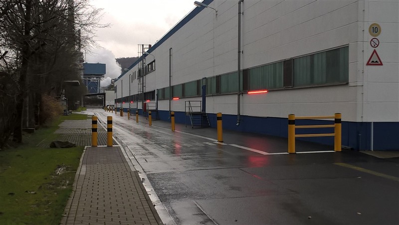 Durch die Umgestaltung des Gehwegbereiches wollte die Essity Operations Witzenhausen GmbH sicherstellen, dass Fahrzeuge als Gefährdung sofort durch eine visuelle Darstellung erkannt werden. Die Umsetzung erfolgte durch den Einbau von unterschiedlichen LED-Leisten im gesamten Gehwegsbereich mit vollautomatischer Ansteuerung. Dabei kamen zwei Methoden zum Einsatz.
