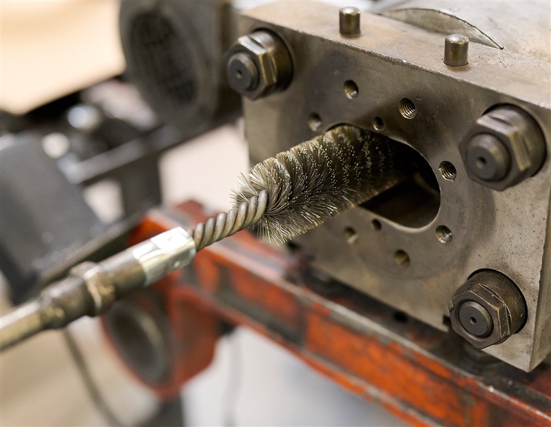 Zur Reinigung von Extruderkanälen wurde bei der AVIENT COMPTEK Kunststoffverarbeitung GmbH eine Vorrichtung mit Wellenschutz entwickelt, in der die bisher von Hand geführte Bohrmaschine mit Bürstenaufsatz eingespannt wird.