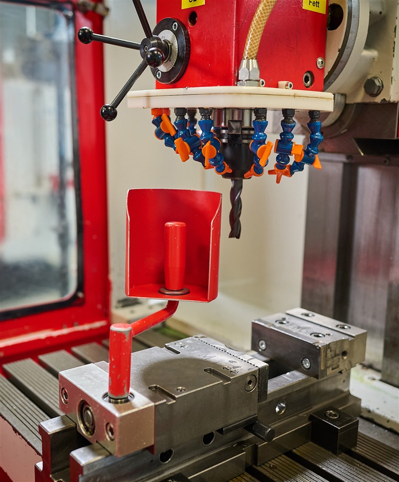 Diese Gefährdung wurde durch die Ausstattung der Standard- Handkurbeln mit einem innovativen drehbaren, mechanischen Handschutz wirksam verringert. Die Hände sind dadurch beim Spannvorgang des Bauteils geschützt und können das Fräswerkzeug nicht berühren. Die Technik-Auszubildenden haben diesen drehbaren mechanischen Handschutz gemeinsam mit den Kolleginnen und -Kollegen vom Ausbildungszentrum entwickelt.