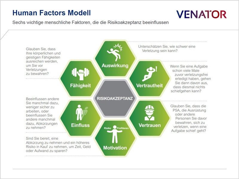 Zwei Schwerpunkte waren zunächst „Gefahrenbewusstsein und Risikoakzeptanz“ und „Menschliche Einflussfaktoren“. Das dritte Modul behandelte eine überarbeitete Version des 60“-Checks: Ein Werkzeug, das bei Venator eingesetzt wird und den handelnden Personen zusätzlich zu Gefährdungsbeurteilungen und Risikoanalysen unmittelbar vor Beginn einer Tätigkeit die nötige Zeit gibt, kurz innezuhalten und die potenziellen Gefahren einer Aufgabe zu berücksichtigen. Diese können anhand einer Gefährdungsliste ermittelt und entsprechende Gegenmaßnahmen ergriffen werden.