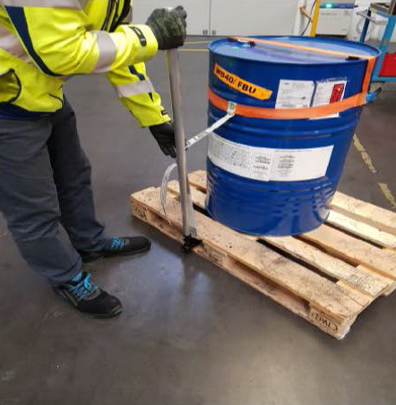 Die in Wiesbaden hergestellten Silikone werden in Fässern auf Paletten zu den Kunden transportiert. Dafür müssen sie mit Gurten gesichert und an den Paletten befestigt werden. Ein Job, der auf den Rücken geht, denn normalerweise müssen sich die Beschäftigten immer wieder bücken, um die Verankerungen an den Paletten zu befestigen.