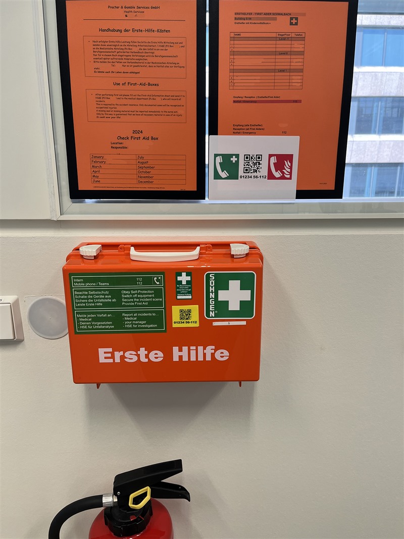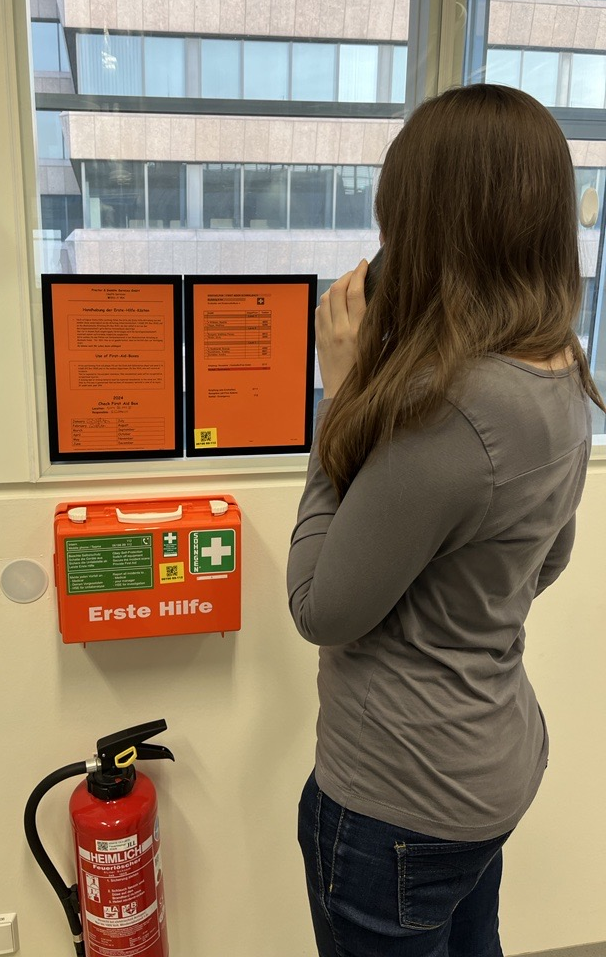 Als Erstes wurden Aufkleber mit dem QR-Code der vollständigen internen Notrufnummer sowie der Nummer in Ziffern per Labeldrucker gedruckt. Diese wurden an Ersthelferlisten und auf Erste-Hilfe-Kästen angebracht, sowie an Kollegen für deren Firmenausweise verteilt. Dies ermöglicht es, die Nummer sowohl an festgelegten Orten immer verfügbar zu haben, sowie im Erste-Hilfe-Fall dezentral mitzunehmen.