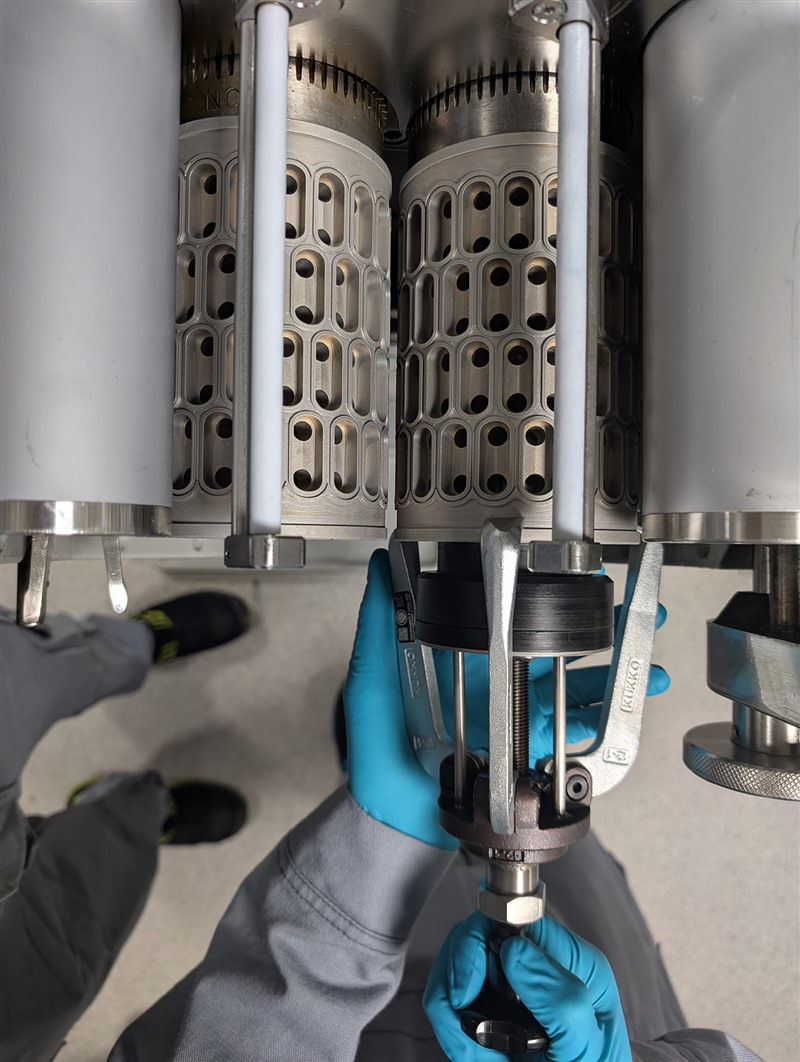 Die Ausbauhilfe wurde aus einem dreiarmigen Abzieher als Basis gebaut und so angepasst, dass er das Formatteil hält, zentriert und abzieht. Dadurch ist der sichere Ausbau während des gesamten Prozesses gewährleistet. Die Ausbauhilfe ist inzwischen reguläres Equipment, welches täglich genutzt wird und so die Beschäftigten effektiv schützt.