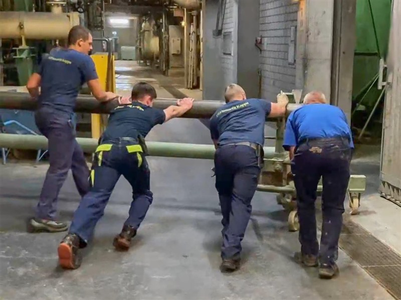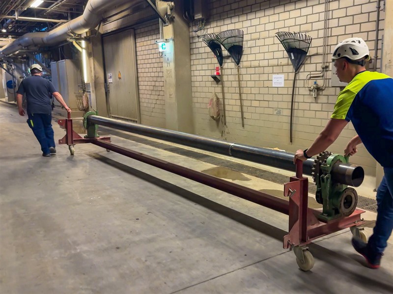 Es wurde jeweils ein Wagen für die alte und für die neue Rolle angefertigt. Zusätzliche Stabilität schafft der deutlich tiefere Schwerpunkt sowie die Arretierung durch Bolzen. Der Wagen ist somit schnell und sicher arretiert. Für den Vorgang werden nur noch zwei Personen benötigt. Die Technik wird nun auf weitere Werke übertragen.
