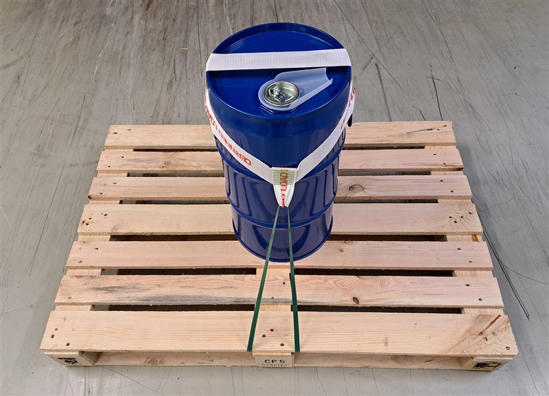 Da es keine geeignete Lösung zur Fixierung von Einzelkleingebinden auf Paletten gab, wurde gemeinsam mit der Firma Rothschenk ein System entwickelt. Ein Haltegurt wird über das Gebinde gelegt und an der Palette niedergezurrt, ergonomisch in Arbeitshöhe. Die Fixierung erfolgt per PET-Band oder wiederverwendbarem Gurt für innerbetriebliche Transporte mit Ratsche. Dies erhöht die Arbeitssicherheit und Nachhaltigkeit.